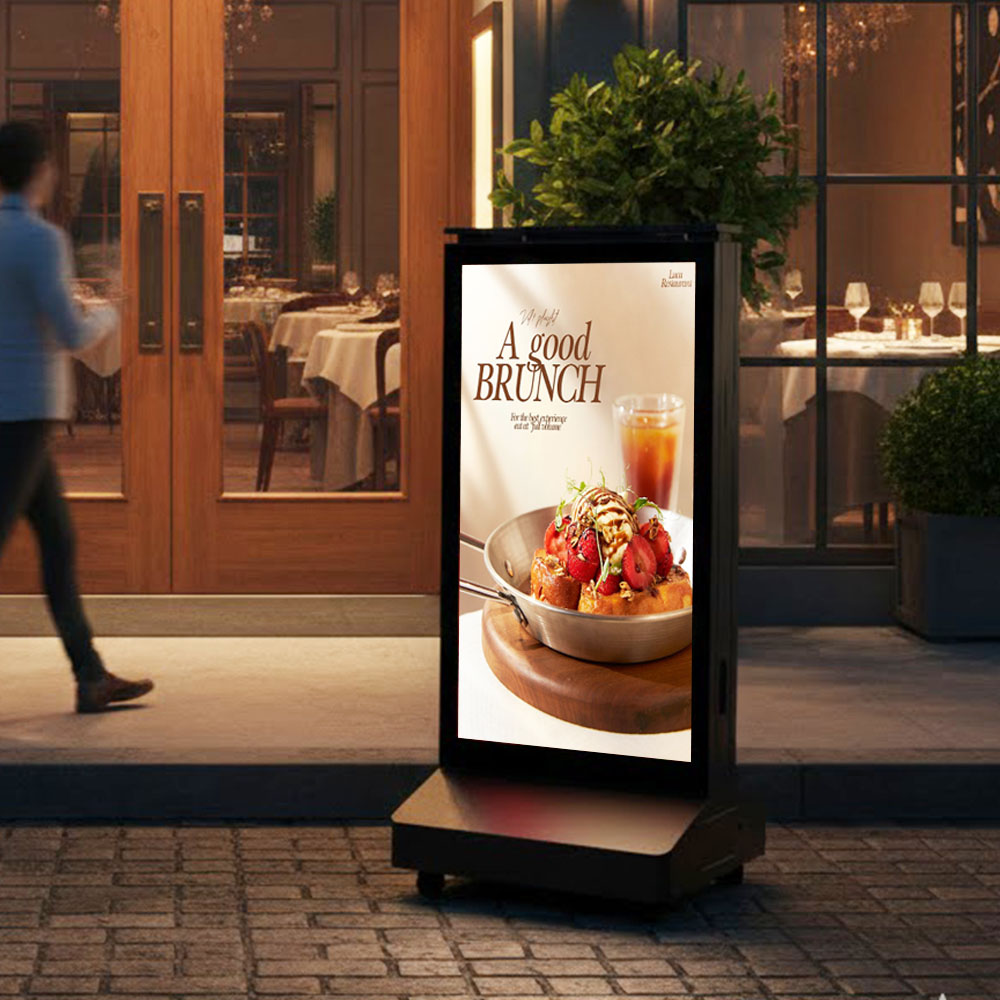 Cet écran LCD portable, alimenté par batterie, est conçu pour une publicité extérieure flexible. Son boîtier robuste en aluminium et son verre trempé antivandale IK10 lui confèrent une excellente protection. Doté d'une batterie haute capacité, il offre jusqu'à 8 heures d'autonomie et se recharge complètement en seulement 6 heures avec un chargeur rapide 20 A. Son écran haute luminosité antireflet garantit une visibilité optimale même en plein soleil, ce qui le rend idéal pour les événements temporaires, les promotions en extérieur et les déploiements en zones isolées.